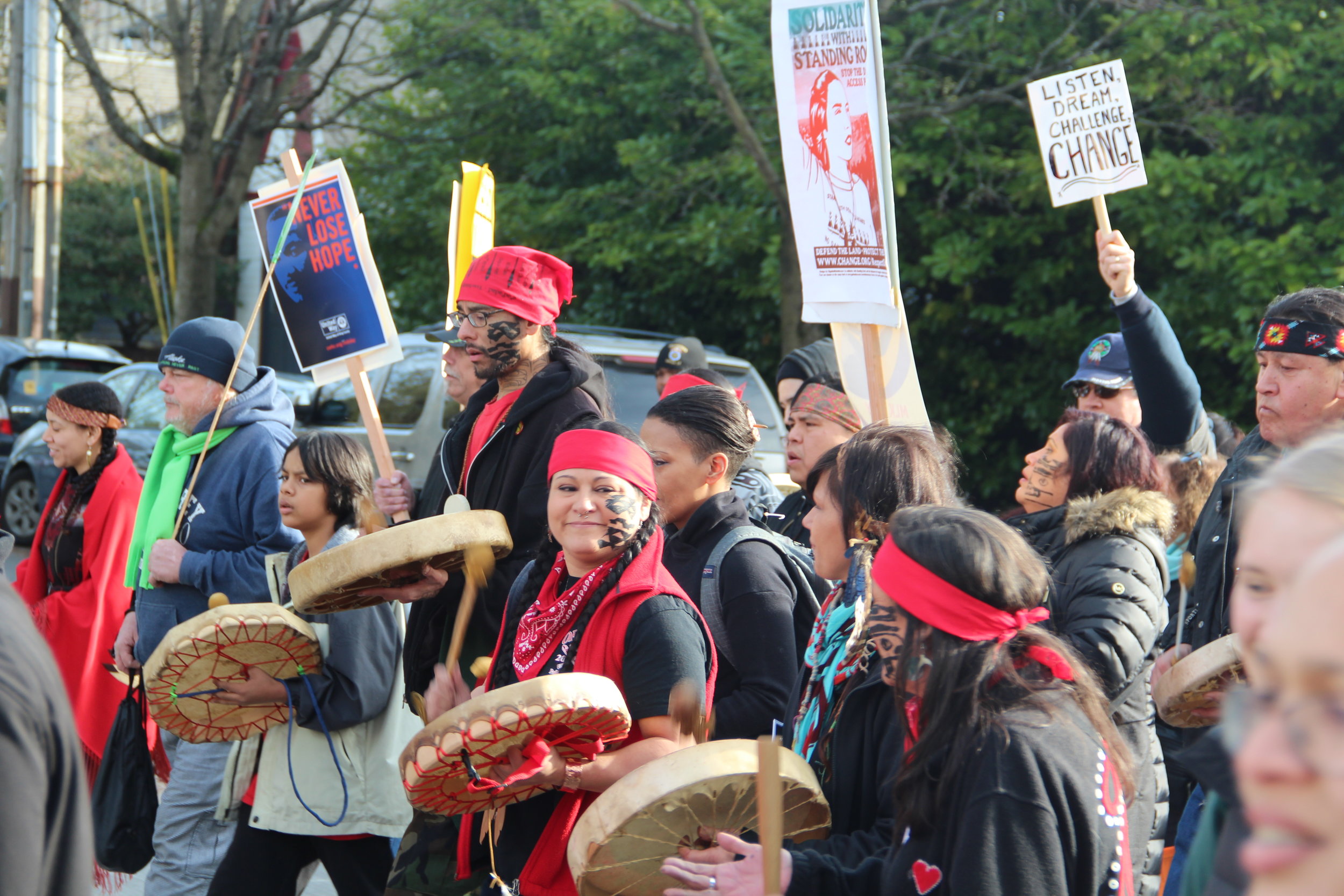 Over 5,000 Native Americans and their allies showed up to walk down the road to the white house, beating drums and dancing and burning bundles of sage. The air was filled with smoke, and with song, prayer, and chants: