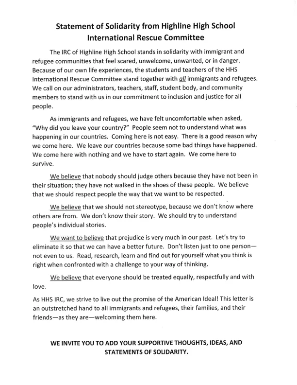 As is so often the case, I have found my greatest role models for tolerance and courage not in those who hold, or aspire to, positions of power, but rather in our very own Highline students. I want to share a Statement of Solidarity from the Highline High School Student International Rescue Committee. These remarkable students inspire and challenge each of us to "respect people the way that we want to be respected [and] strive to live out the promise of the American ideal." I encourage you to read and share this powerful, honest statement with your children, family and friends knowing it represents the best of who we are as a school system and community.
