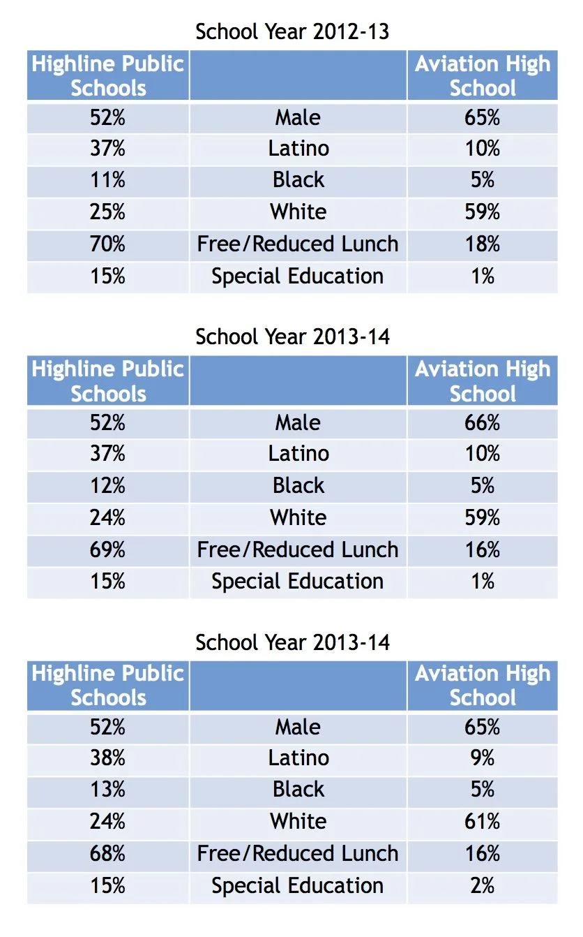 These are private school numbers driven by private school selection processes, and yet Raisbeck Aviation High School in the Highline School District has been consistently lauded by (predominantly white) legislators and school board members since its inception — lauded by many of the very people who have objected to charter schools, which hope to serve primarily high-needs students and seek to make their application process as sparse as administratively possible.